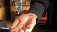 何も持っていない手で透明の水のボトルを取り、口を下に向けます。
